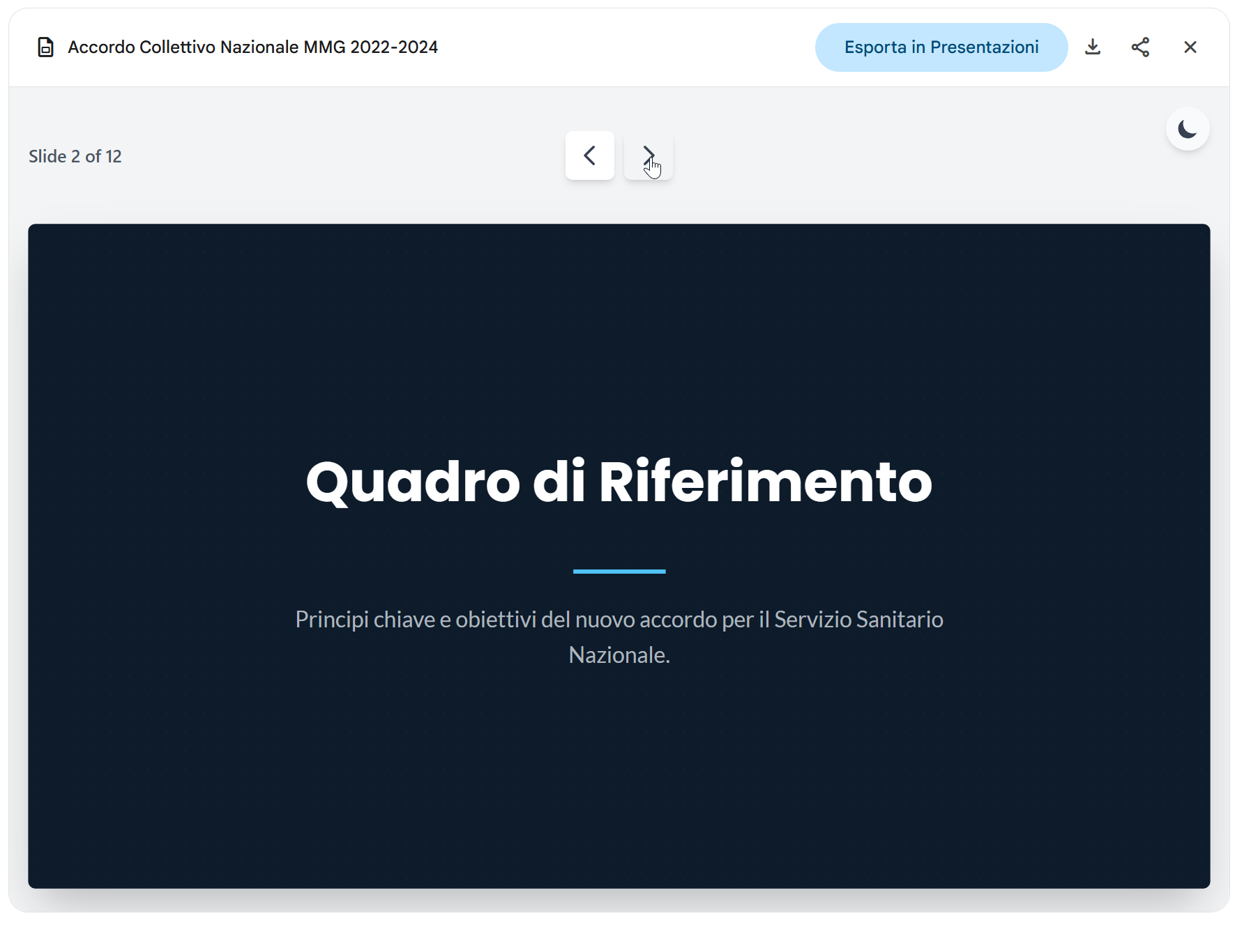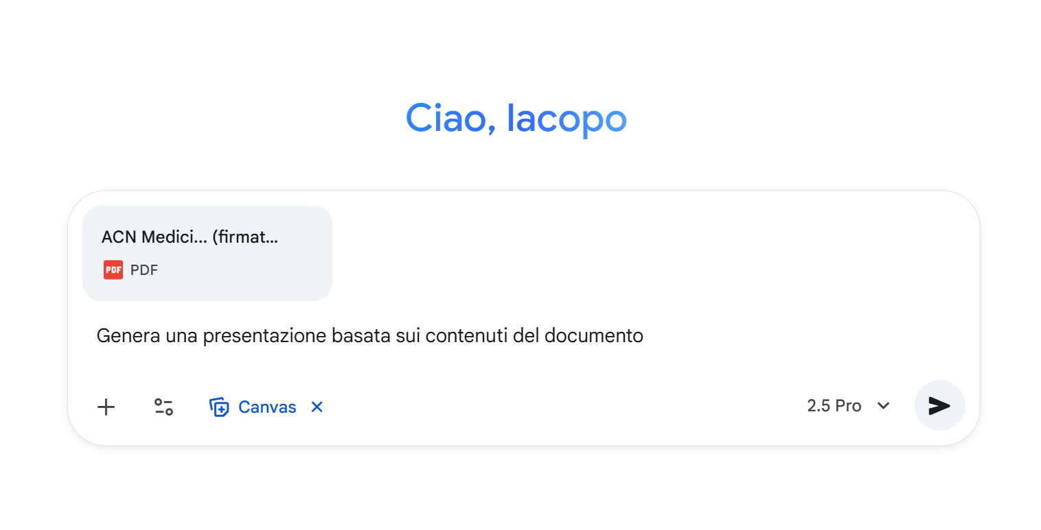 Attiva Canvas in Gemini, carica un PDF o un documento Word e chiedi: โ๐๐ฟ๐ฒ๐ฎ ๐๐ป๐ฎ ๐ฝ๐ฟ๐ฒ๐๐ฒ๐ป๐๐ฎ๐๐ถ๐ผ๐ป๐ฒ ๐ฑ๐ถ๐ฑ๐ฎ๐๐๐ถ๐ฐ๐ฎ ๐ฝ๐ฒ๐ฟ ๐บ๐ฒ๐ฑ๐ถ๐ฐ๐ถ, ๐ฐ๐ผ๐ป ๐๐ฎ๐ฏ๐ฒ๐น๐น๐ฒ ๐ฒ ๐ด๐ฟ๐ฎ๐ณ๐ถ๐ฐ๐ถ ๐ฐ๐ต๐ถ๐ฎ๐ฟ๐ถ, ๐๐๐ถ๐น๐ฒ ๐ฝ๐ฟ๐ผ๐ณ๐ฒ๐๐๐ถ๐ผ๐ป๐ฎ๐น๐ฒ, ๐ฝ๐ฟ๐ผ๐ป๐๐ฎ ๐ฝ๐ฒ๐ฟ ๐๐ผ๐ผ๐ด๐น๐ฒ ๐ฆ๐น๐ถ๐ฑ๐ฒ๐.โ