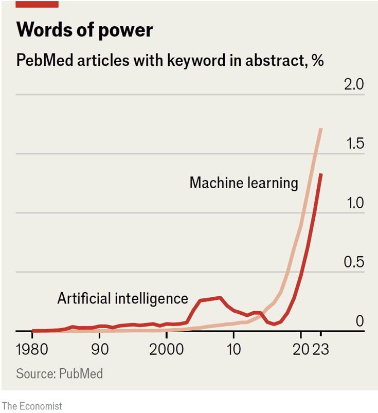 Il grafico pubblicato da The Economist mostra qualcosa di straordinario: la percentuale di articoli PubMed che contengono il termine โ๐ฎ๐ฟ๐๐ถ๐ณ๐ถ๐ฐ๐ถ๐ฎ๐น ๐ถ๐ป๐๐ฒ๐น๐น๐ถ๐ด๐ฒ๐ป๐ฐ๐ฒโ o โ๐บ๐ฎ๐ฐ๐ต๐ถ๐ป๐ฒ ๐น๐ฒ๐ฎ๐ฟ๐ป๐ถ๐ป๐ดโ sta crescendo in modo esponenziale.
