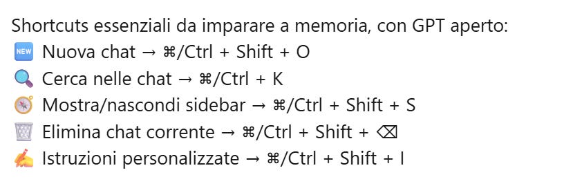 Shortcuts essenziali da imparare a memoria, con GPT aperto: