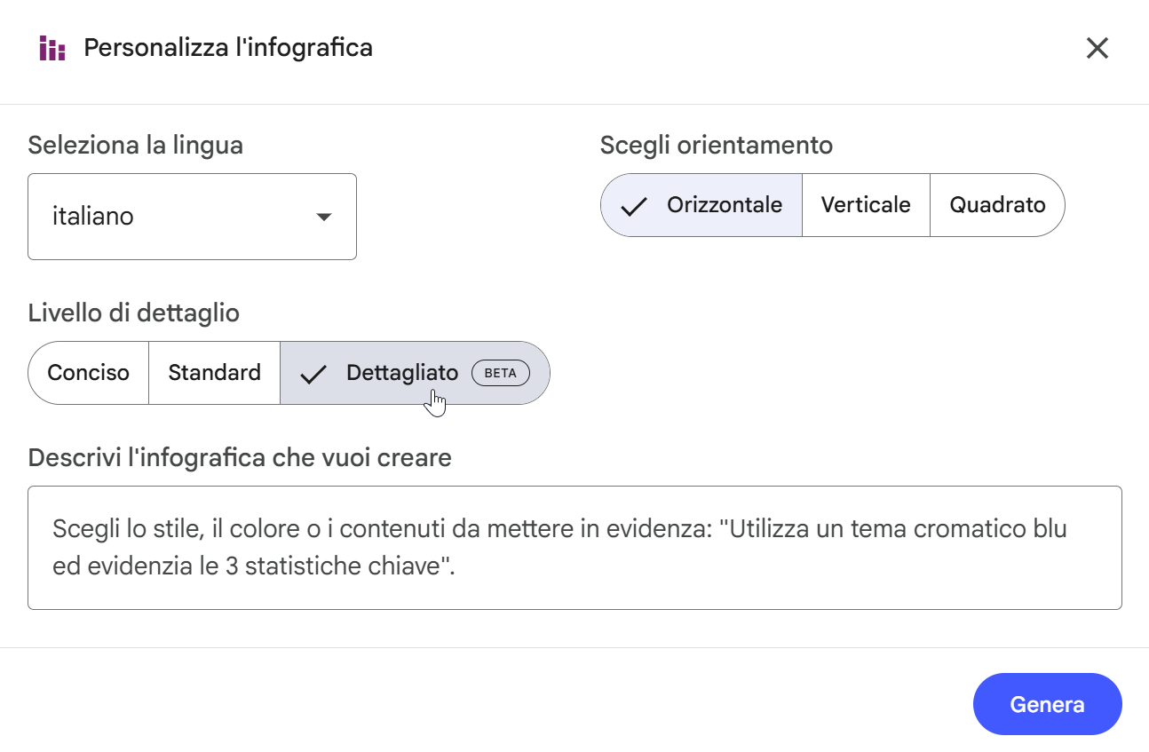 Nelle impostazioni della Infografica, incolla uno dei prompt qui sopra.