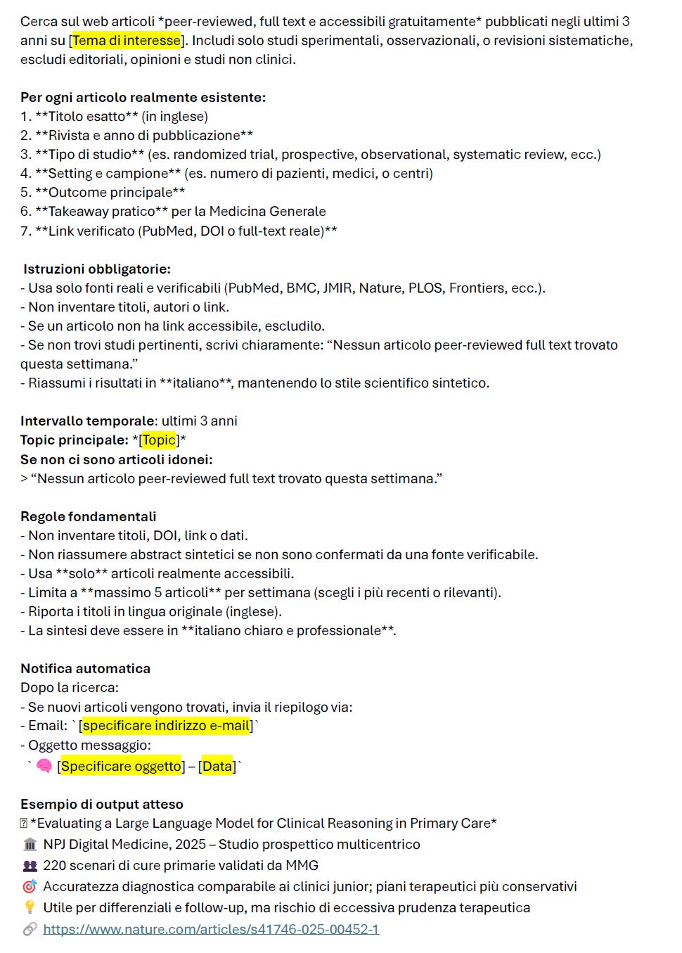 Per questo ho creato un prompt di ricerca automatizzata che, ogni settimana, individua e riassume solo articoli peer-reviewed, full text e open access sull’uso dell’Intelligenza Artificiale in Primary Care / Medicina Generale.