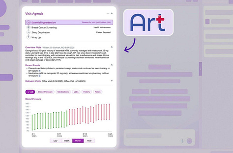 Emmie & Art: la coppia paziente‑clinico. Emmie educa e prepara i pazienti prima della visita; Art riassume, ascolta durante la visita, compila note, verifica coperture, può mettere ordini o validare prior‑auth.