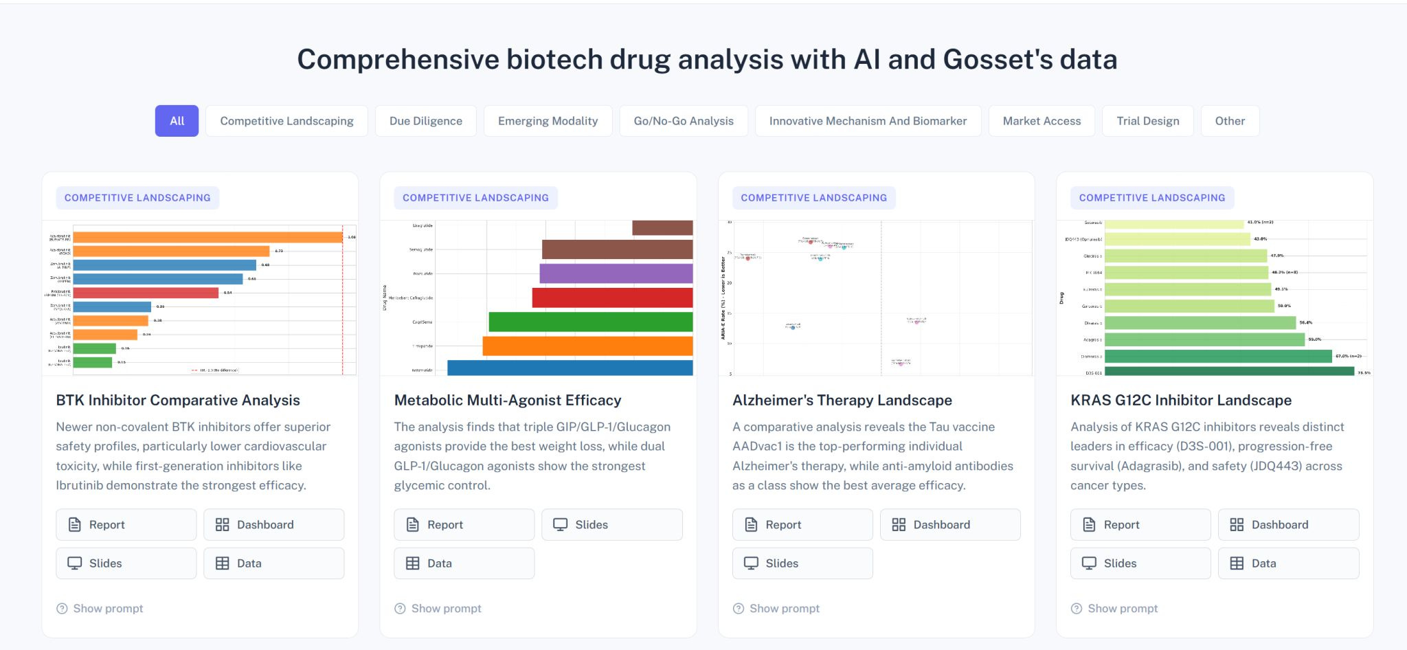 𝗚𝗼𝘀𝘀𝗲𝘁 è una piattaforma di 𝗯𝗶𝗼𝗽𝗵𝗮𝗿𝗺𝗮 𝗶𝗻𝘁𝗲𝗹𝗹𝗶𝗴𝗲𝗻𝗰𝗲 che integra dati clinici, scientifici e di mercato e li trasforma in insight chiari, confrontabili e immediatamente utilizzabili da chi prende decisioni.