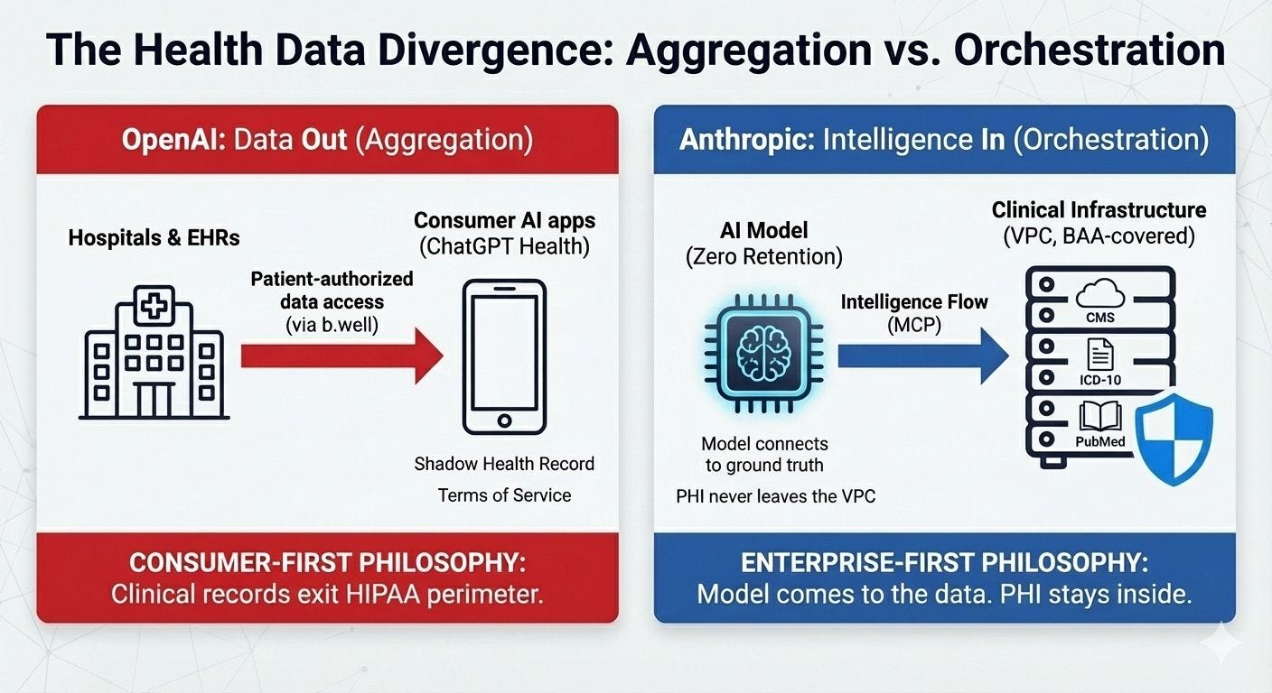 Divergenza strategica tra un approccio consumer-first (GPT Health), che porta i dati clinici fuori dal perimetro sanitario, e un approccio enterprise-first (Claude for Healthcare", in cui l’intelligenza viene portata dentro l’infrastruttura clinica lasciando i dati al loro posto