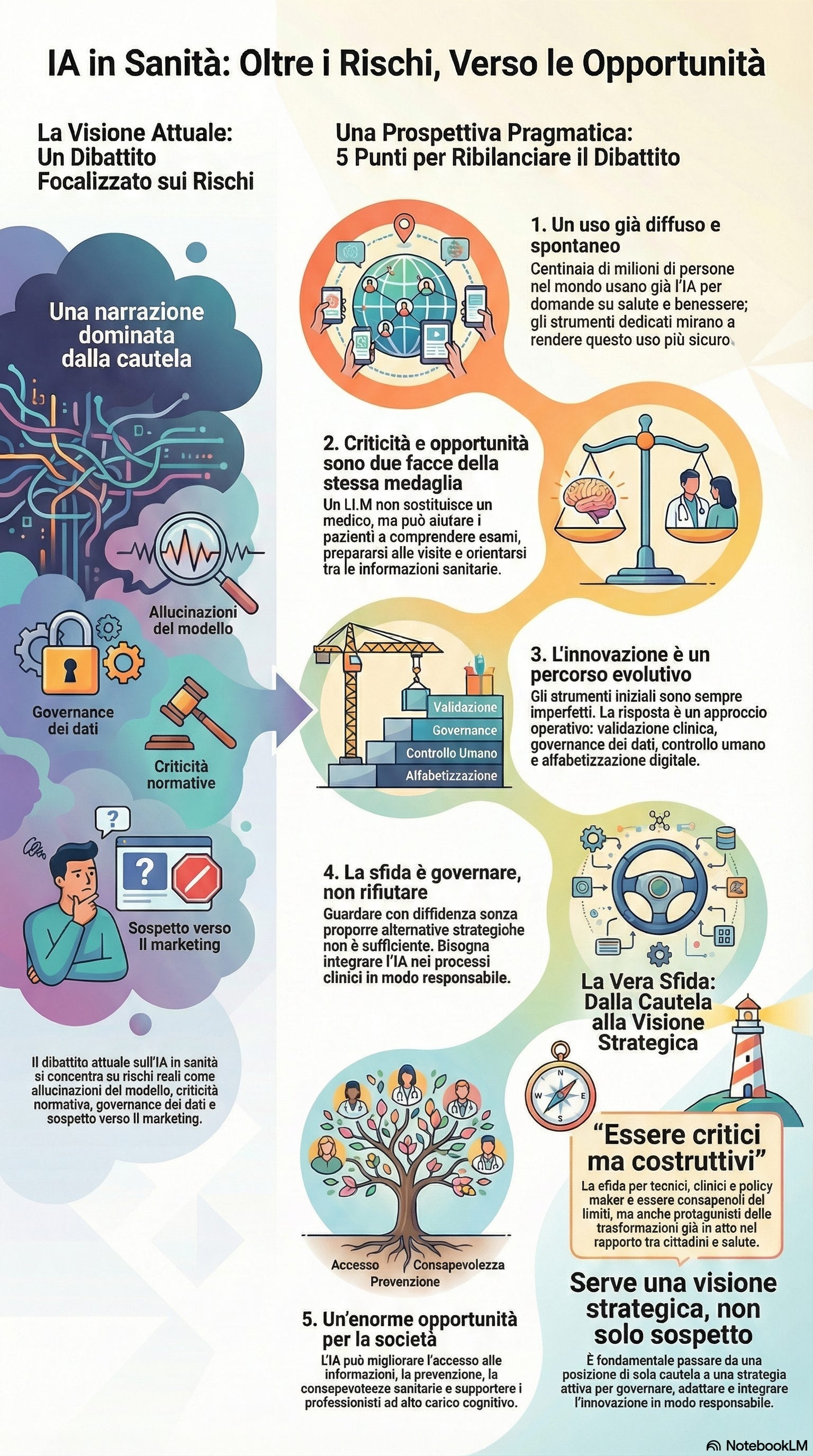 Questi strumenti portano con sé un’enorme opportunità sociale. Migliorare l’accesso alle informazioni, rafforzare la prevenzione, aumentare la consapevolezza sanitaria, supportare i professionisti nei processi ad alto carico cognitivo. Per coglierla serve visione strategica, non solo cautela o sospetto per principio.
