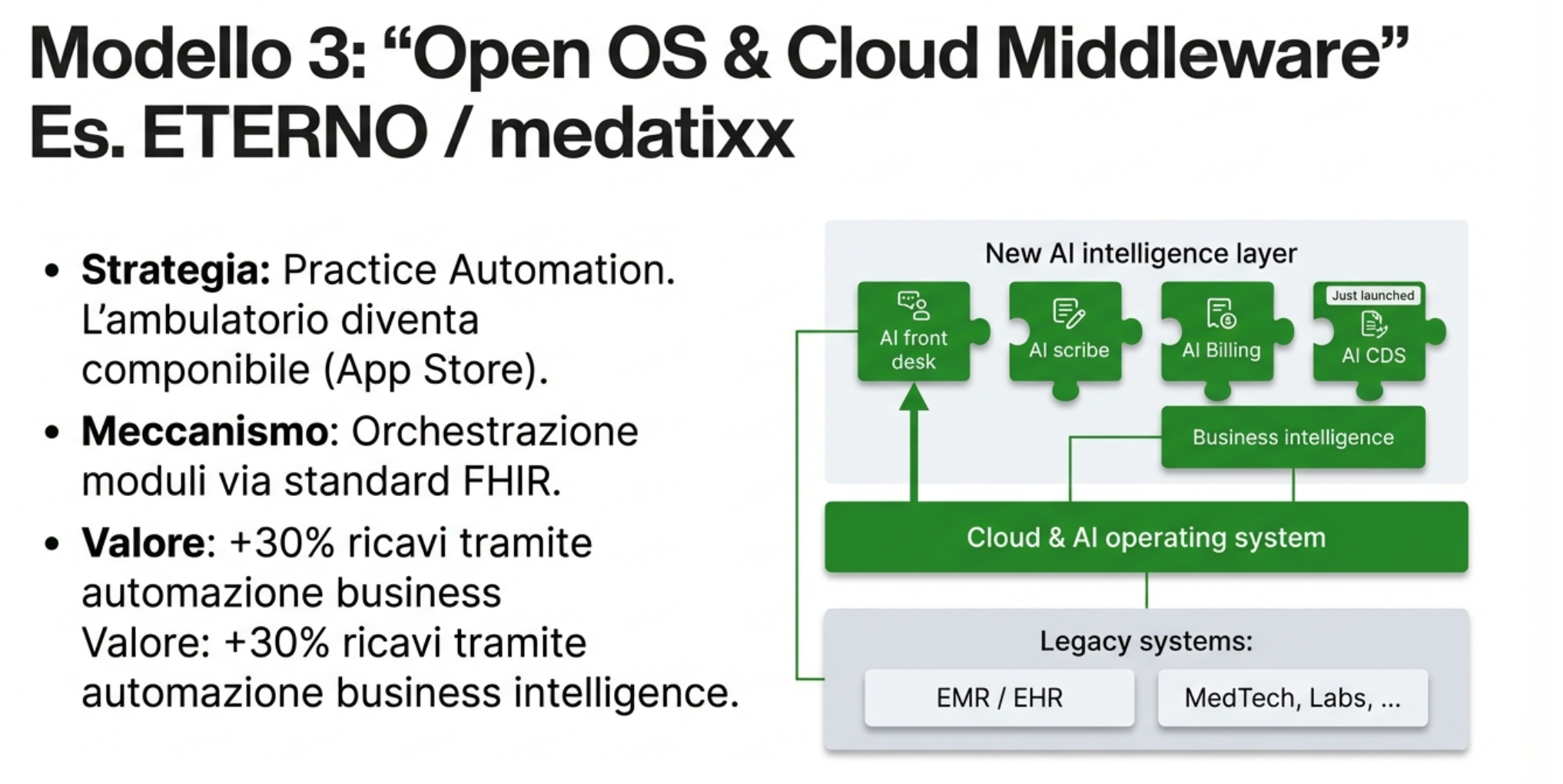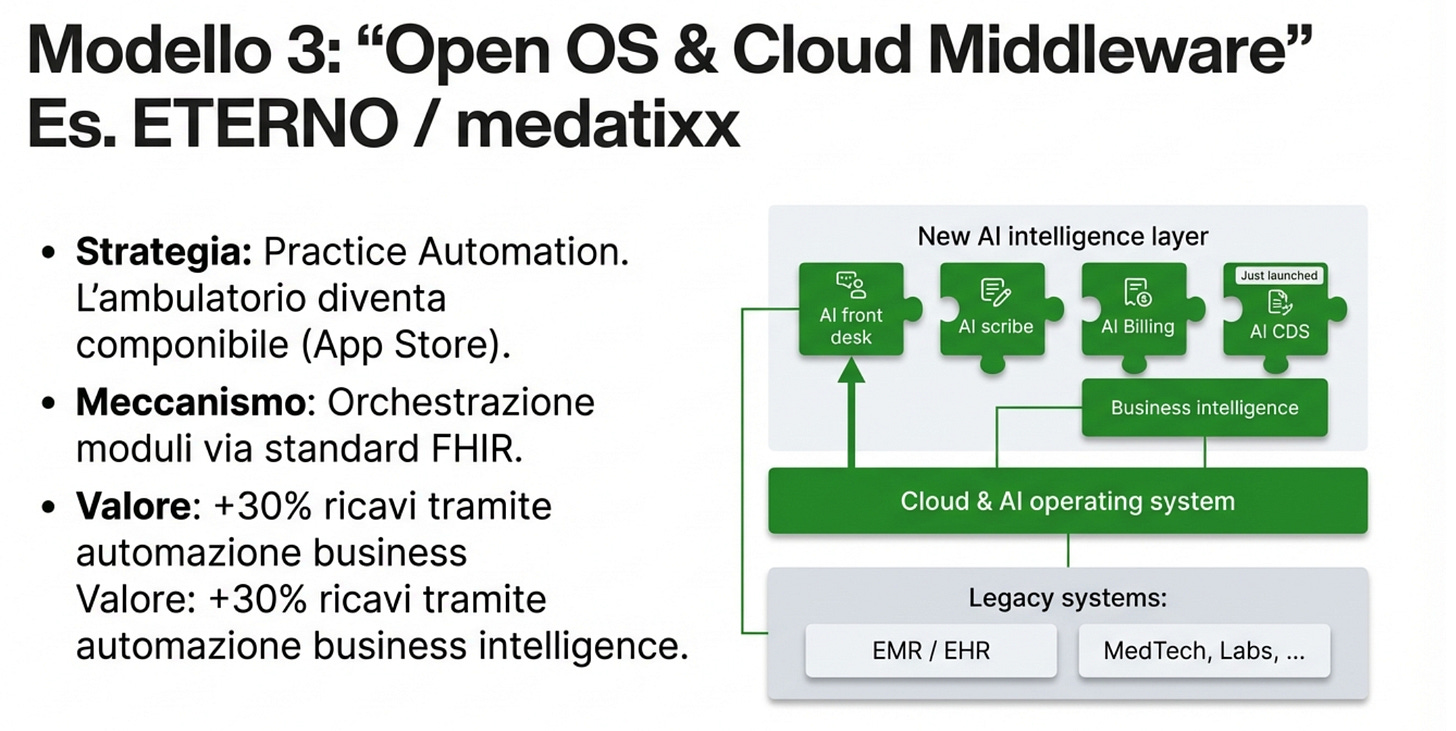 Un livello che fa da regista tra cartella, agenda, servizi, AI e analisi. Pro: scegli il meglio pezzo per pezzo. Contro: serve governance e standard seri, altrimenti diventa caos.