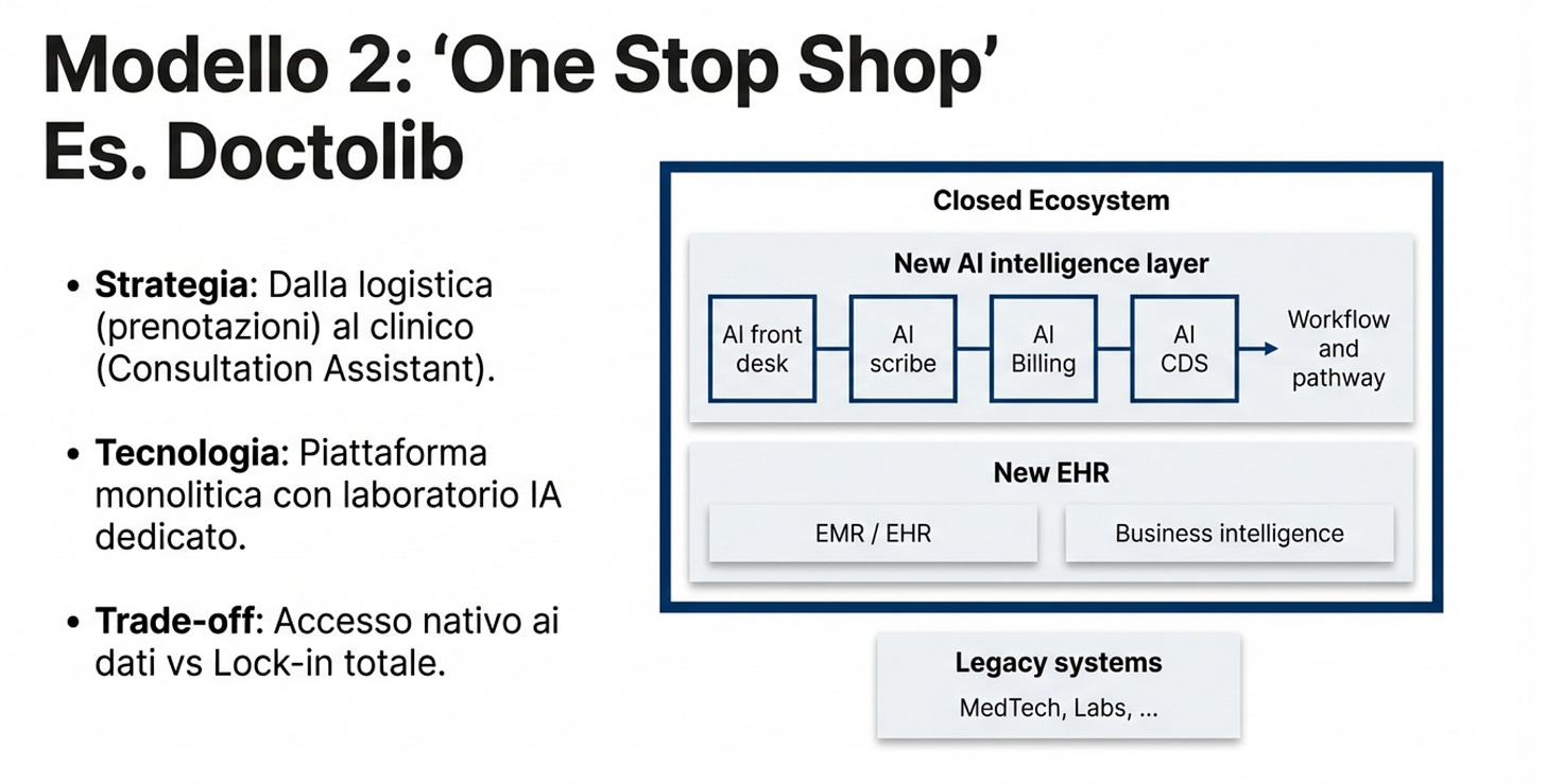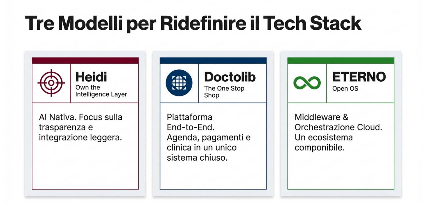 Doctolib fa l’opposto. È già una piattaforma completa. Ora ci mette sopra l’AI, usando i dati e i passaggi operativi che già controlla. È potente. Ma è anche un modello più chiuso.