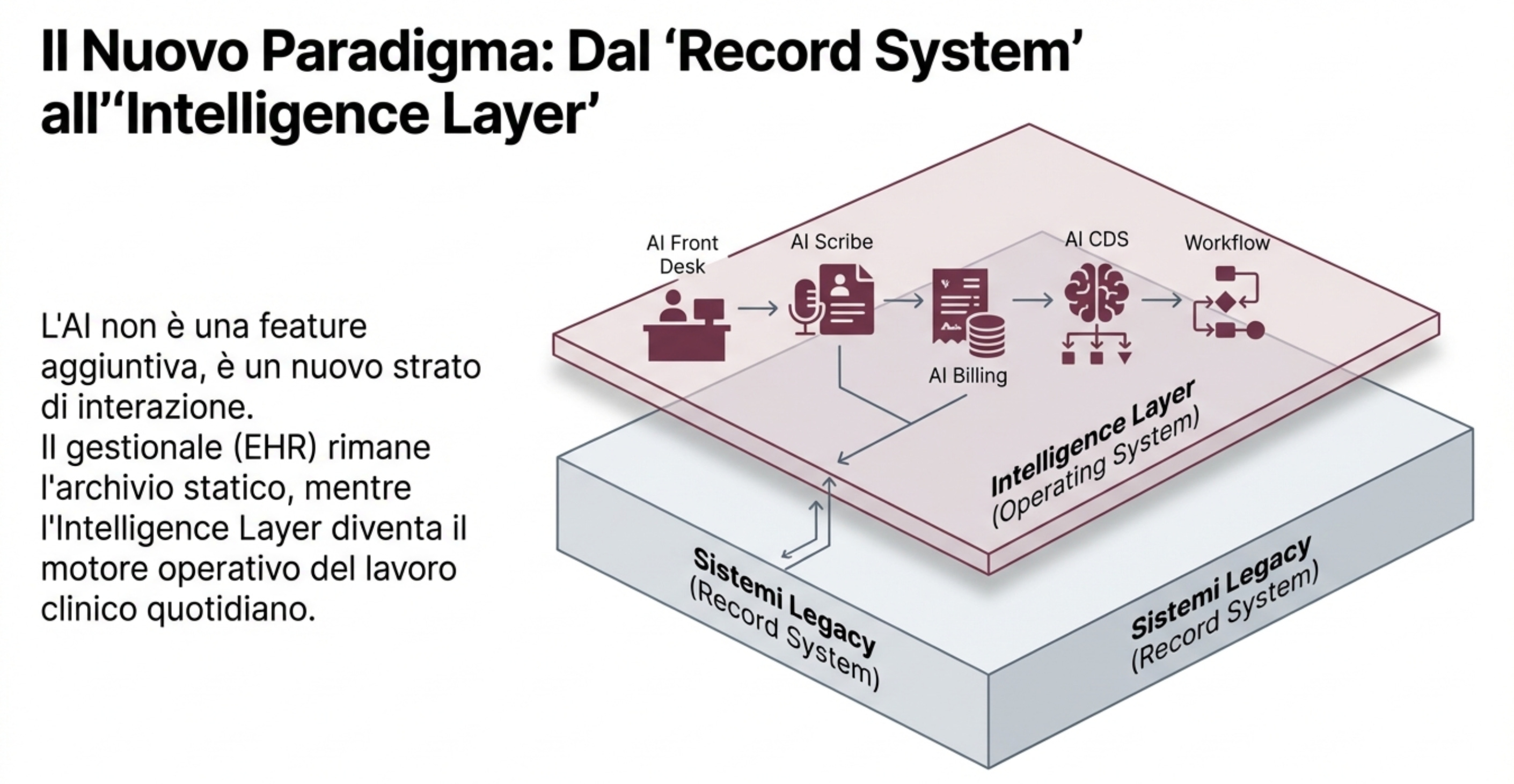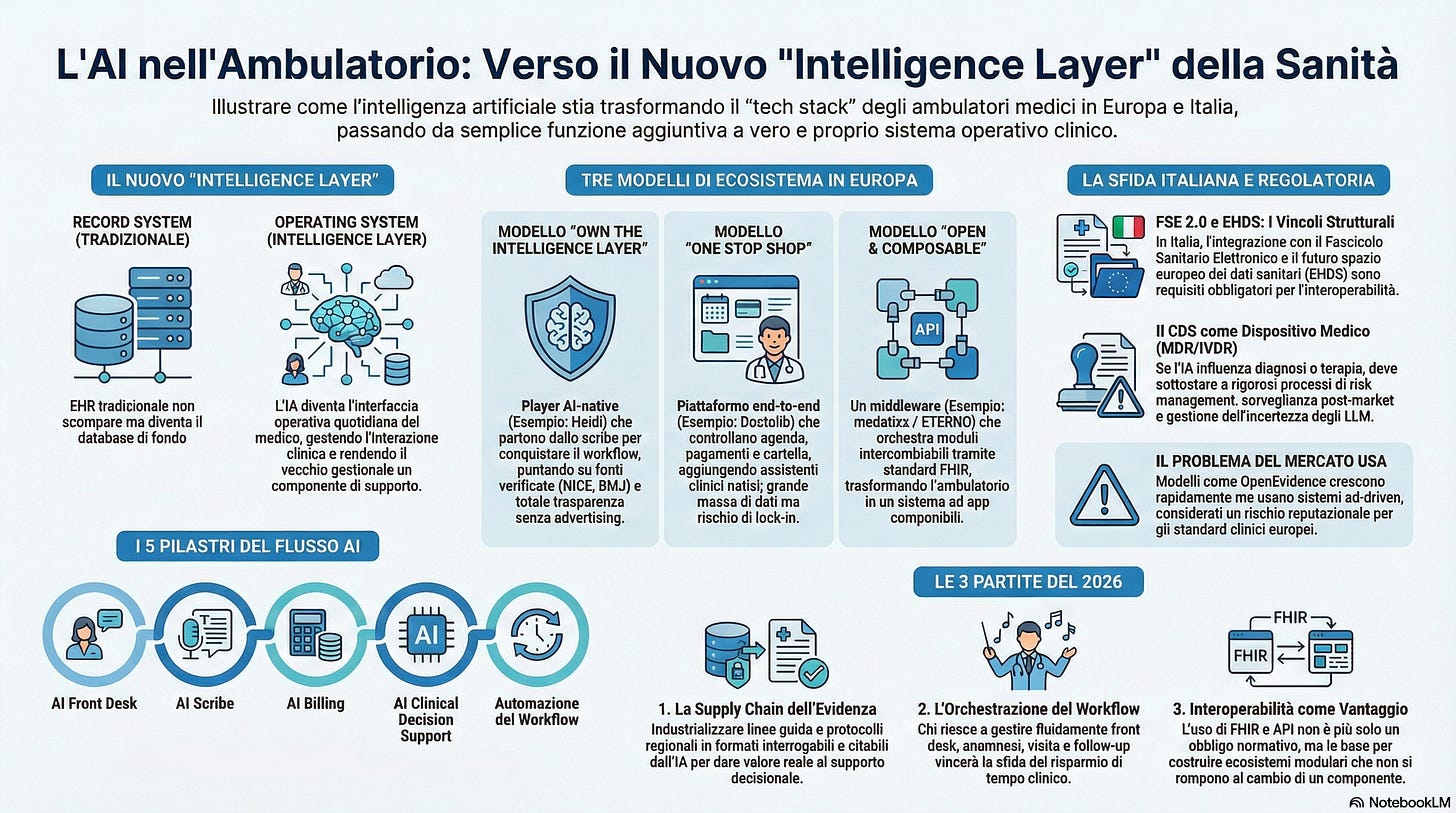 In pratica un livello nuovo, sopra i software classici, che diventa il punto centrale della visita. La cartella clinica resta fondamentale, ma rischia di diventare sempre più “archivio ufficiale”, mentre la parte viva della visita passa dallo strato AI.
