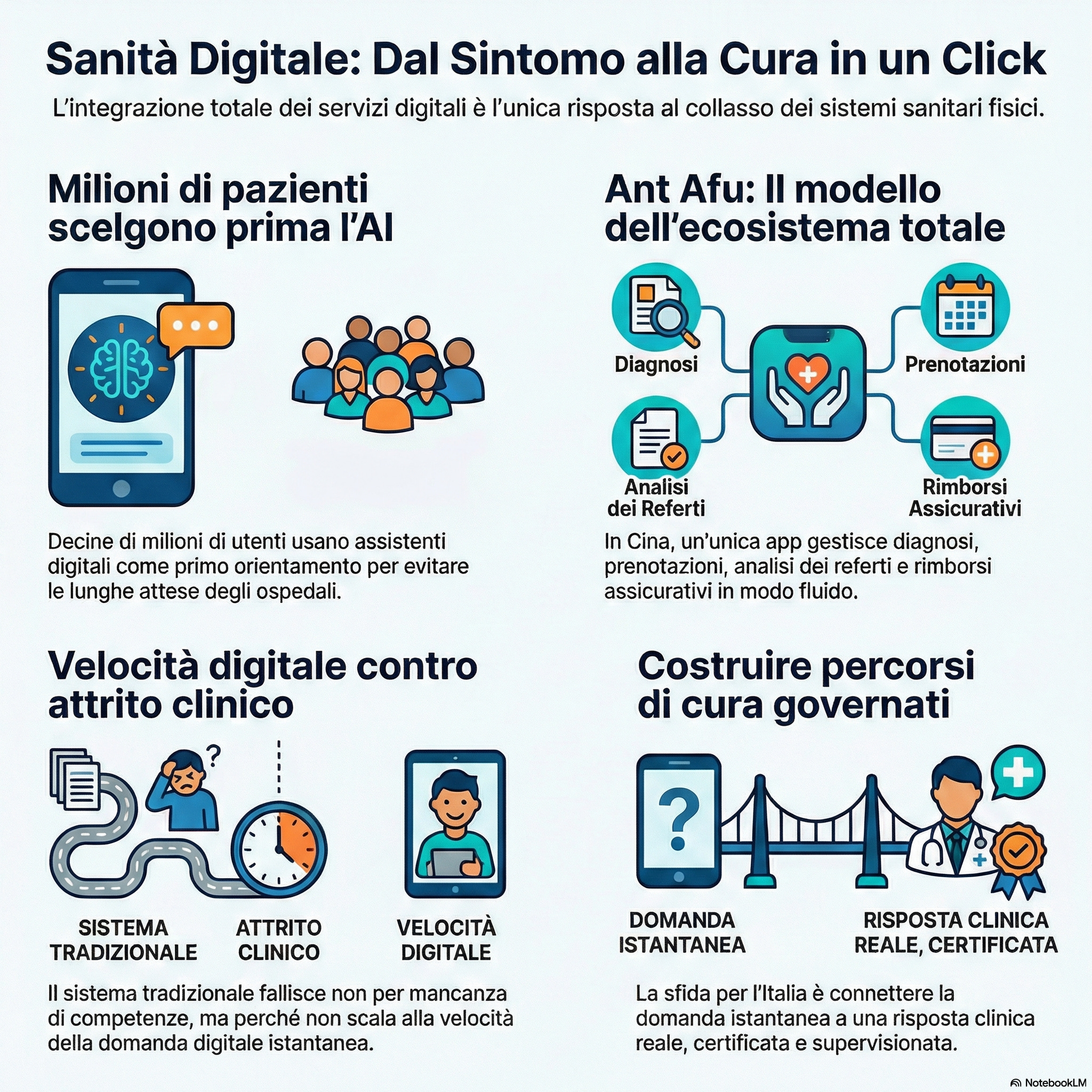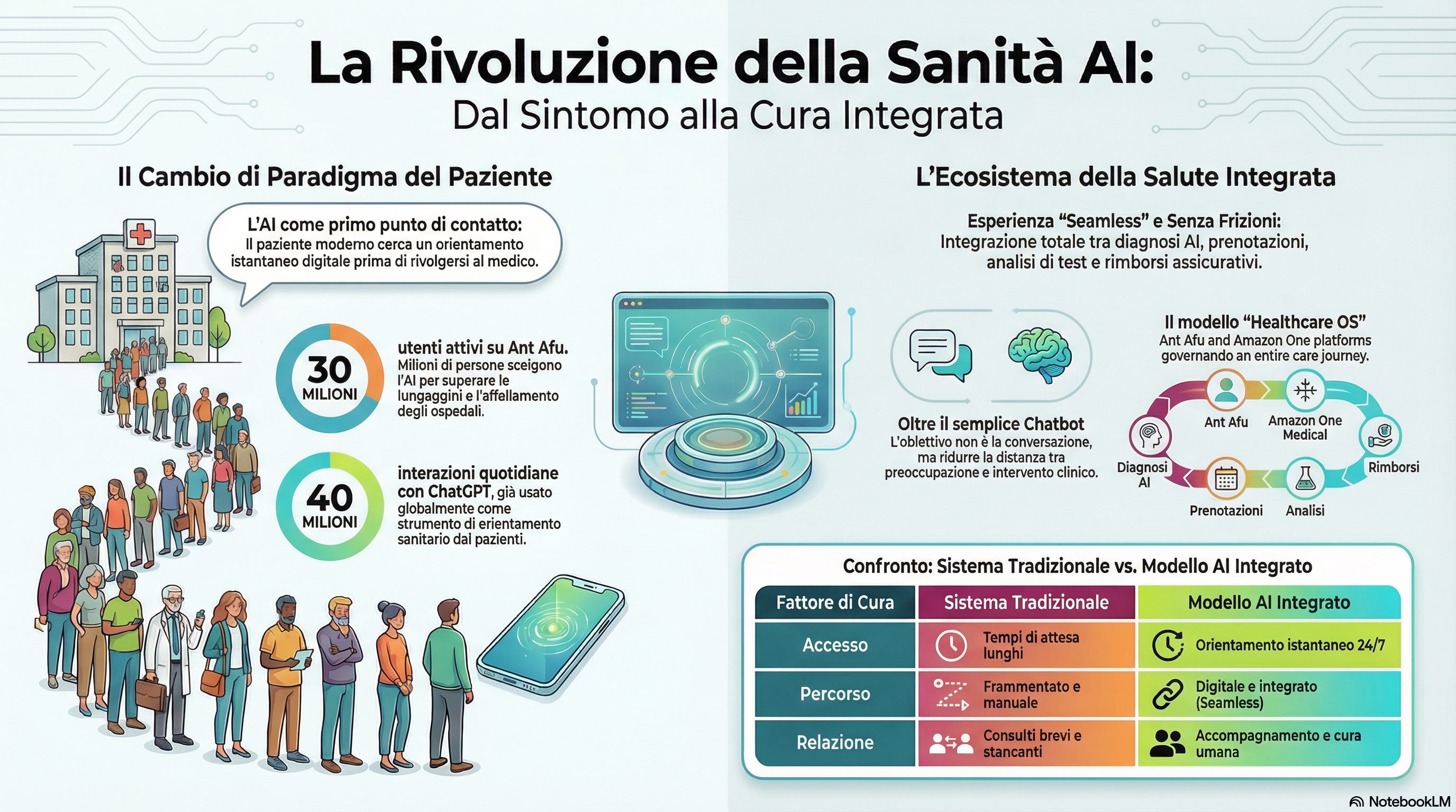 In Cina oggi succede già con un’app dentro Alipay, chiamata Ant Afu, che ha raggiunto 30 milioni di utenti attivi e integra in un’unica esperienza: domande sulla salute, prenotazioni, interpretazione di esami e perfino gestione delle pratiche assicurative.