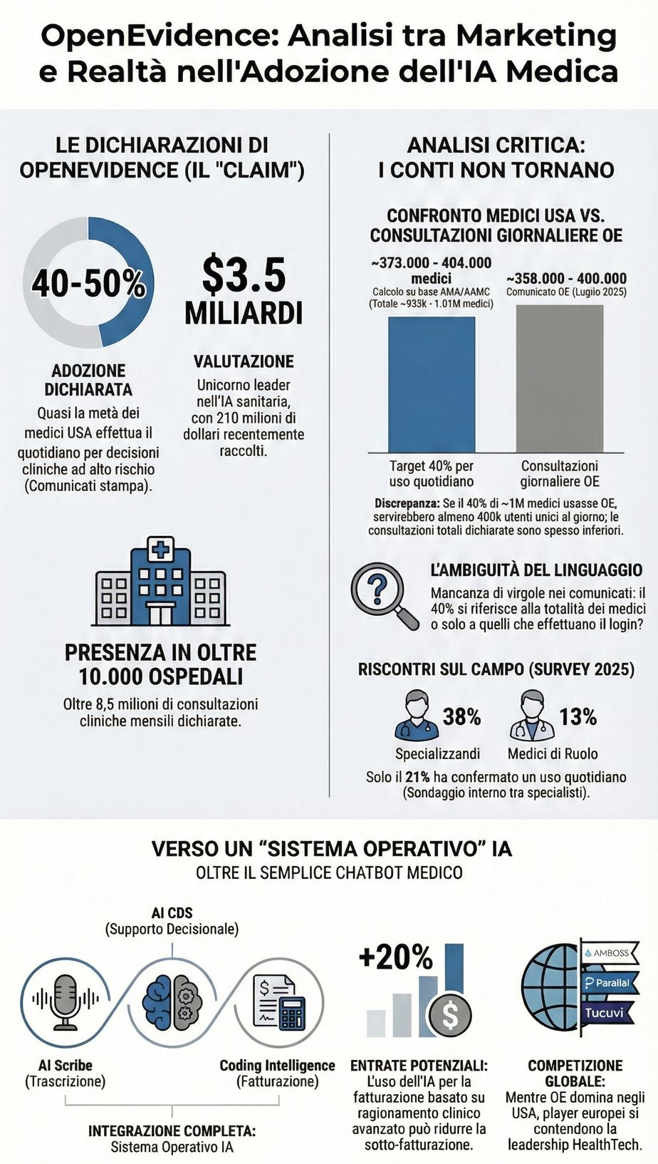 Partiamo dai numeri che fanno girare la testa e muovono miliardi di dollari nel mondo dell'Healthcare. Le recenti comunicazioni di OpenEvidence, definito da alcuni il "ChatGPT per la medicina", parlano di un'adozione massiccia da parte dei medici statunitensi, stimato al 40% dei medici USA.