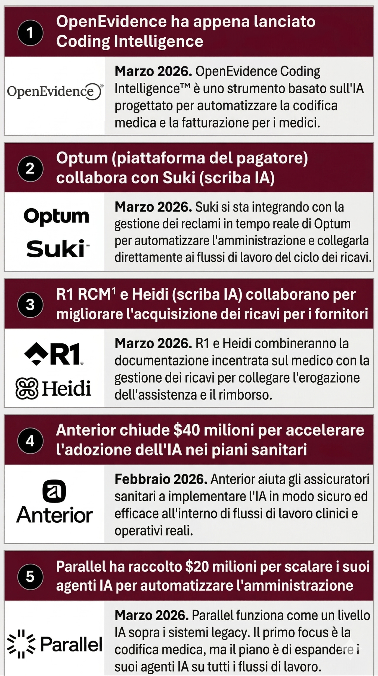 L'evoluzione di piattaforme come OpenEvidence (e di competitor come Heidi) dimostra una chiara convergenza: l'unione tra Scribe AI per la trascrizione, Supporto alle Decisioni Cliniche (CDS) e, ora, l'Intelligenza Artificiale per il coding e la fatturazione.